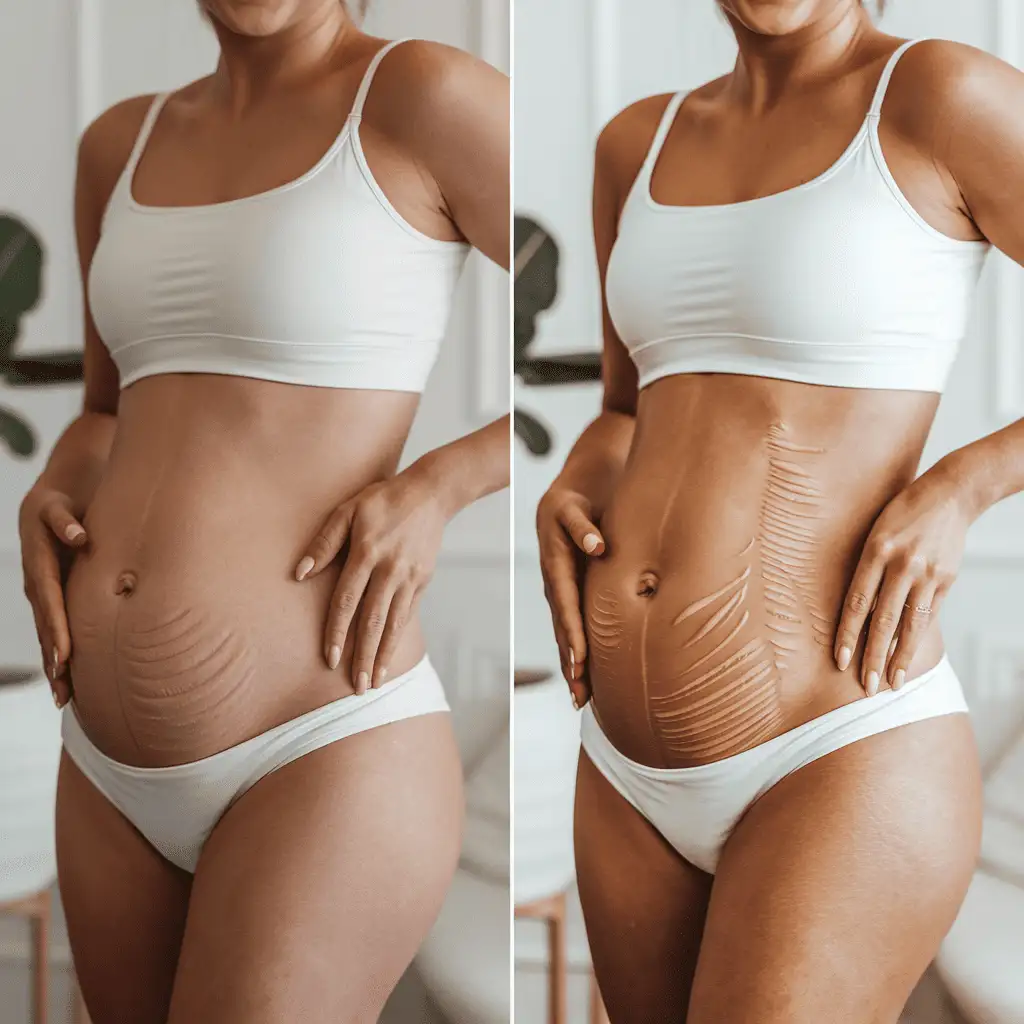 Incentivando a regeneração da elastina, O RLT pode ajudar a restaurar parte da flexibilidade natural da pele, reduzindo a profundidade e a largura das estrias.